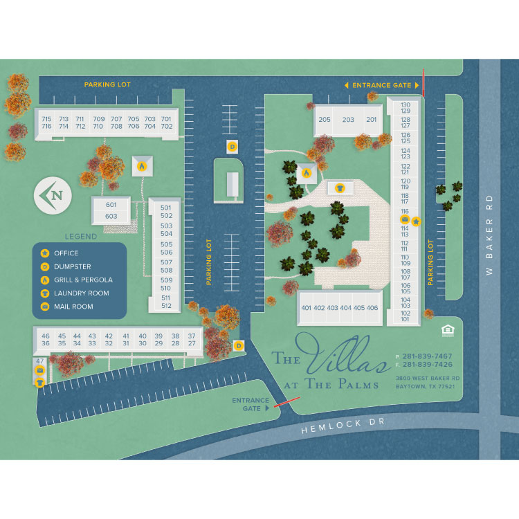 Discover the charm of Texas living at Villas at the Palms apartments in Baytown, Texas. Our quaint community is situated just off West Baker Road. Within minutes of our ideal location, you will find fantastic shops, delicious dining, fun entertainment, and local parks. Our residents enjoy easy access to William B. Travis Elementary, Baytown Junior, and Robert E. Lee High School. An exciting lifestyle is waiting for you at the Villas at the Palms.